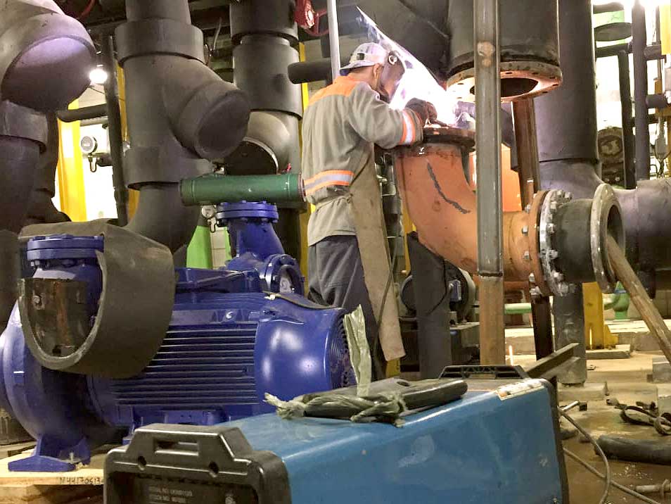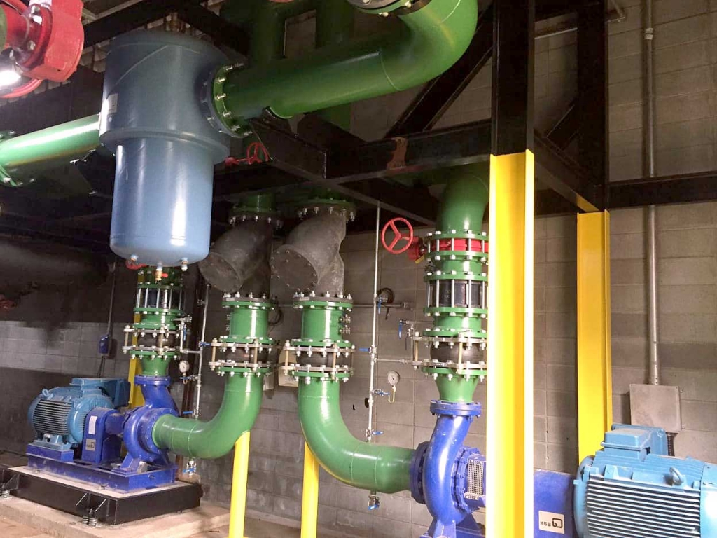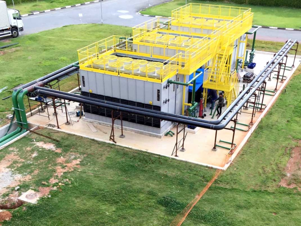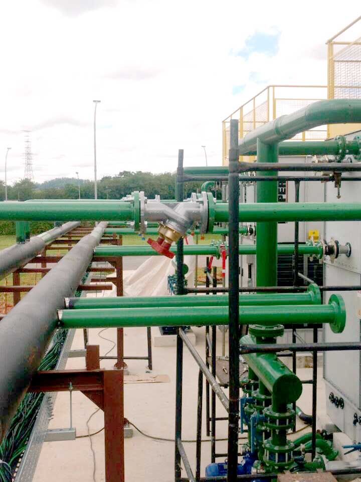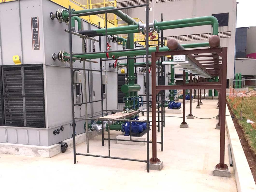 Fabricação e montagem do sistema de geração e distribuição de água gelada (chiller, torres de resfriamento, trocadores de calor e bombas).